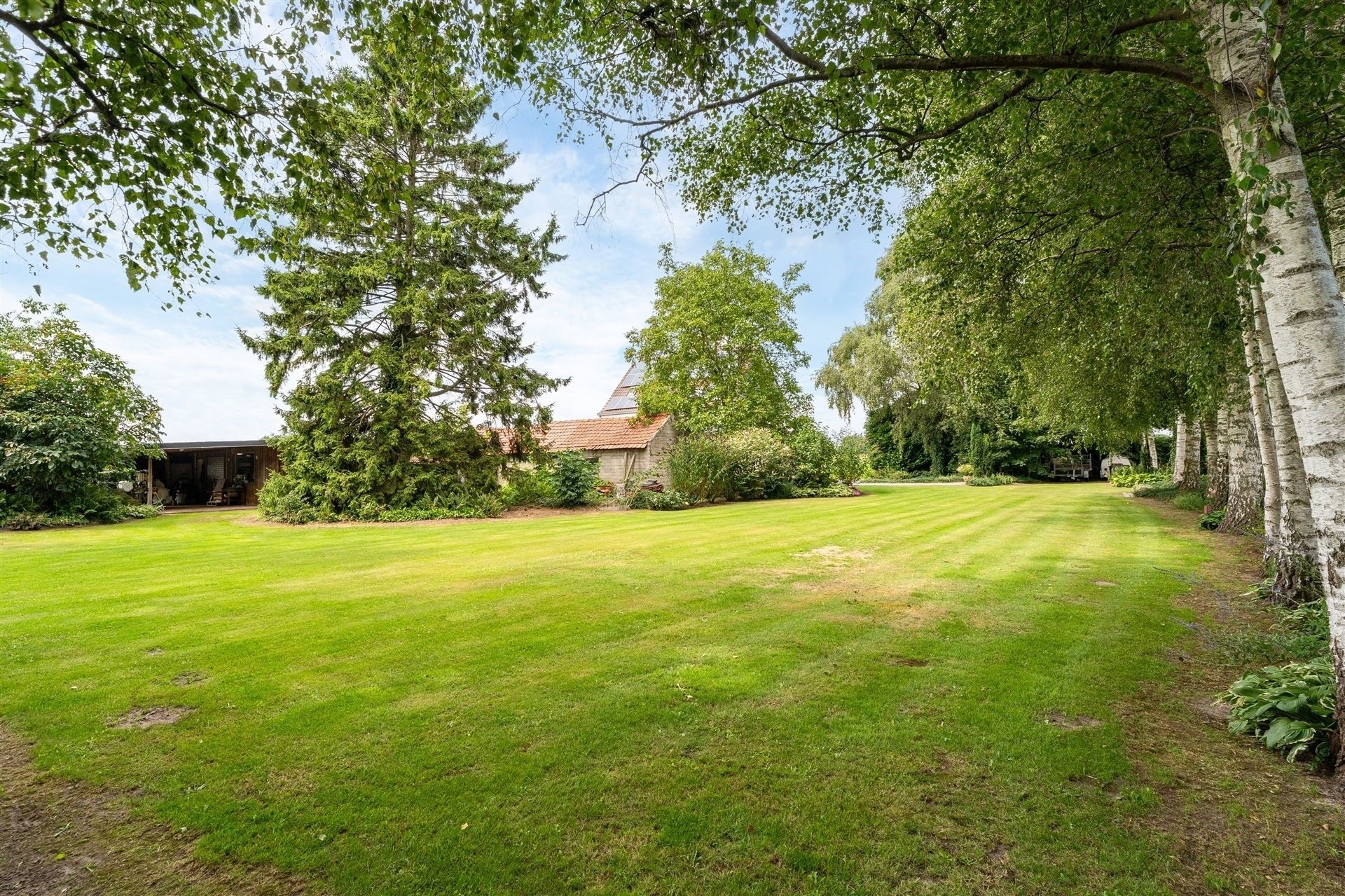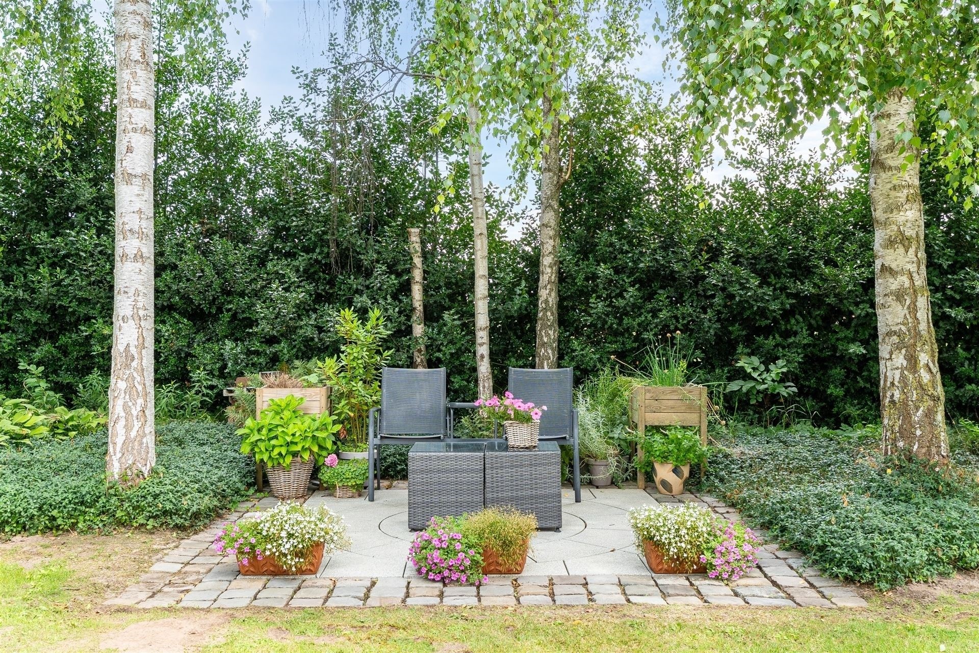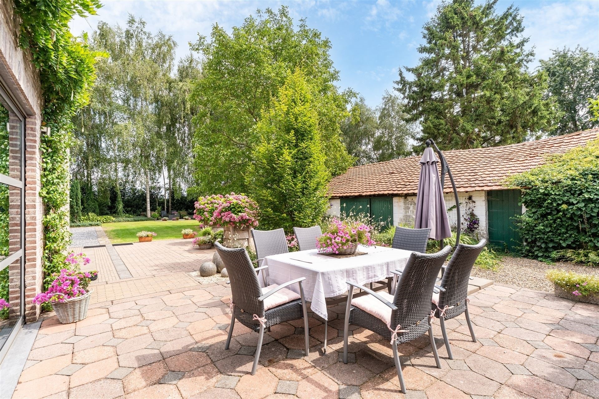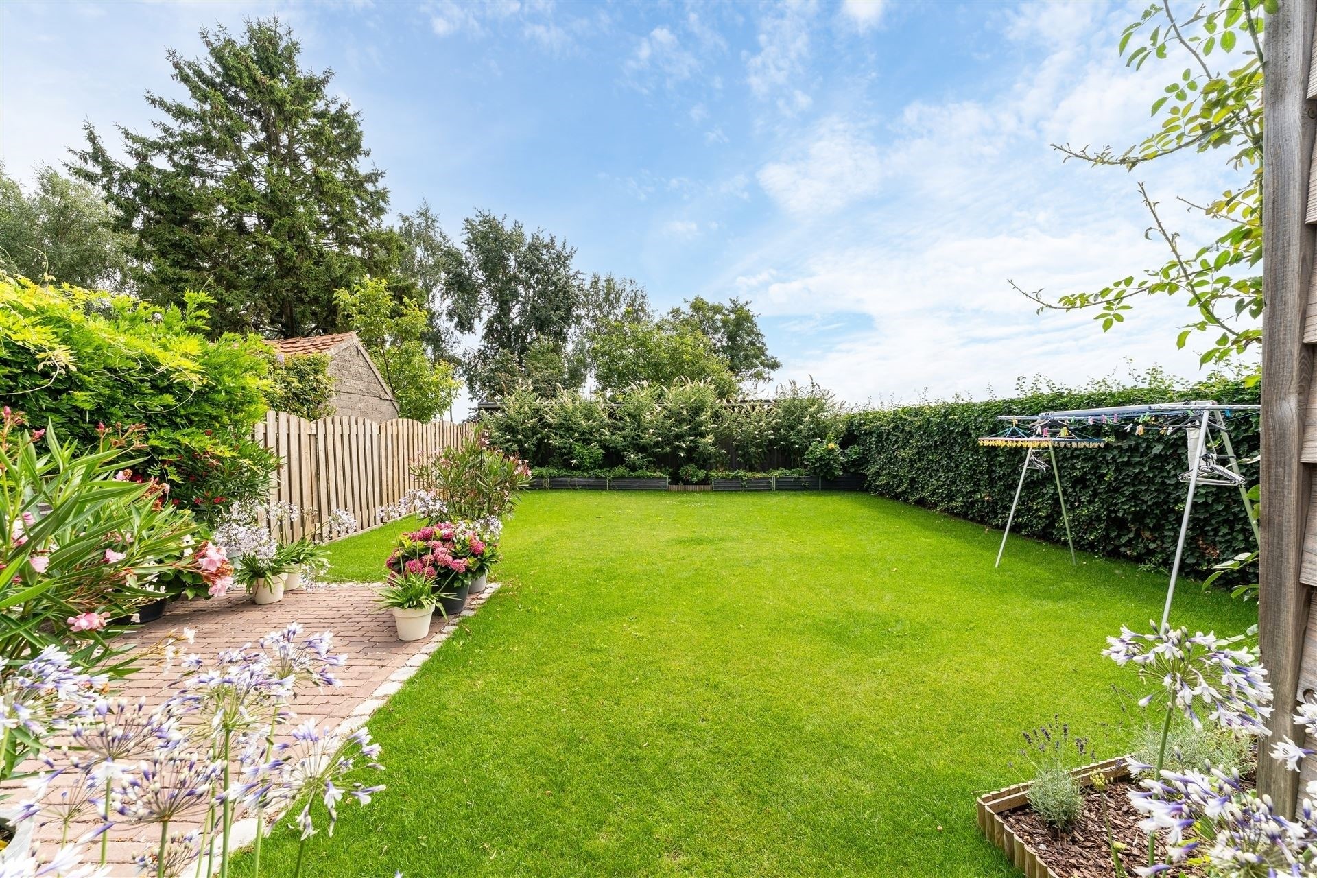De tuin heeft een oppervlakte van 26a 34ca met een aangelegd terras, werkhuis en opslagplaats.