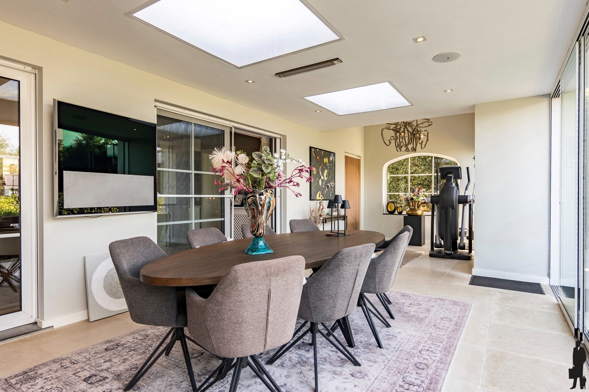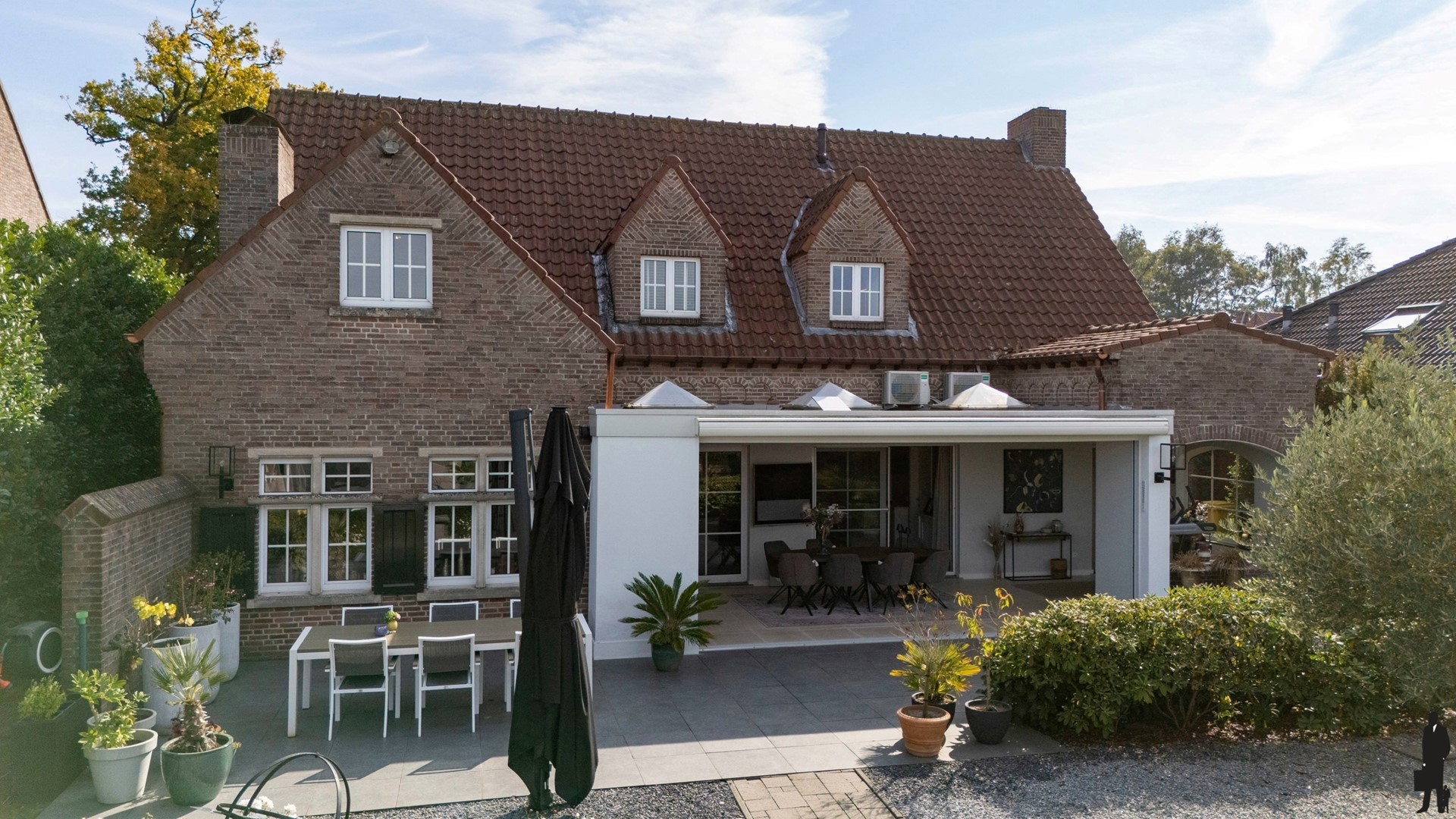 Op warme dagen schuiven de glazen wanden volledig open en wordt het buitenleven naar binnen getrokken.