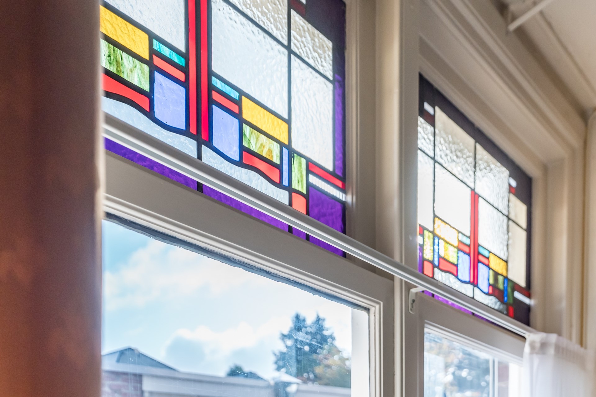 De glas-in-loodramen benadrukken de karakteristieke jaren ’30-stijl.